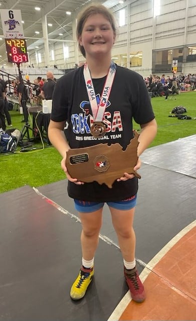 “My seventh-grade year I won most of the tournaments I entered and was runner-up at junior high state. My eighth-grade year I didn’t do so well at state, but I got involved in OKWA wrestling and finished fourth. Last year I made the finals of junior high state, won OKWA, and went 20-2 in duals finishing second to a girl from Comanche at OSSAA state.”